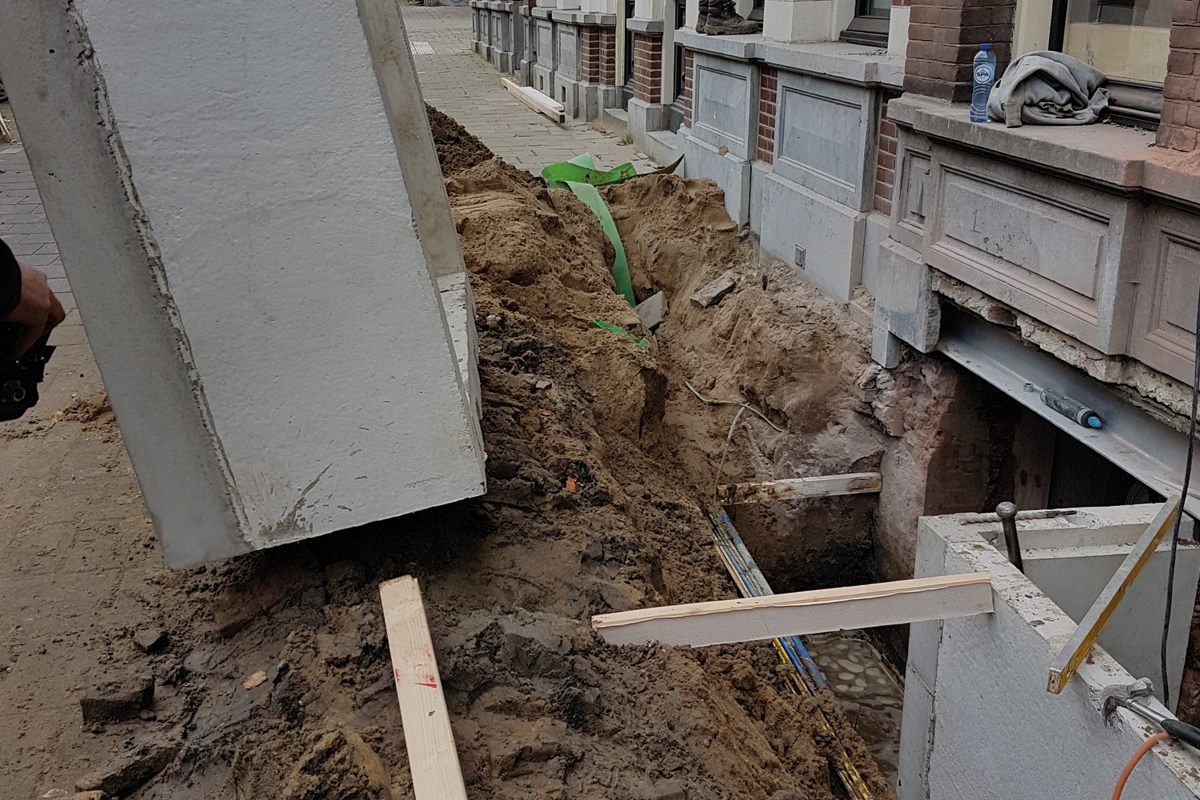 Zoals te zien op de foto’s lagen er nogal wat kabels en leidingen in de weg, wat betekende dat we het grootste gedeelte handmatig moesten uitgraven. Om meer ruimte in de kabels te creëren hebben we aan beide kanten extra meters uitgegraven zodat de kabels er omheen konden en de koekoeks konden worden geplaatst.