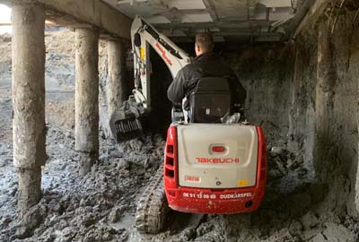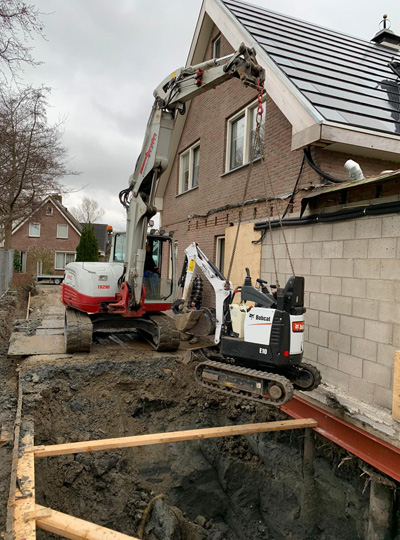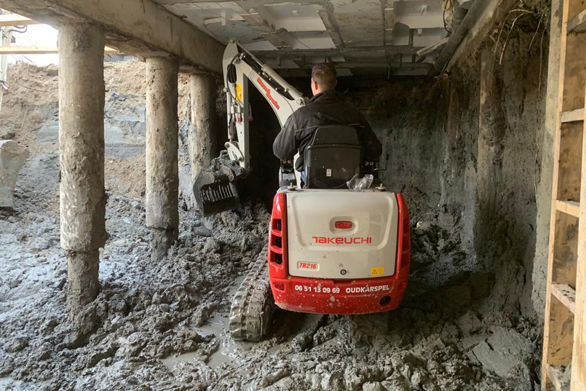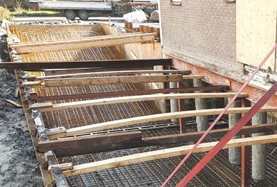 We hebben hier eerst damwanden geslagen en deze gestut, zodat de grond op zijn plek bleef, en wij de kelder konden uitgraven. Toen de kelder eenmaal was uitgegraven hebben wij hier een werkvloer in gestort en kon de heier de palen erin draaien. Doordat de huidige constructie moest worden opgevangen hebben we eerst diverse poeren gestort waarop we een staalconstructie konden zetten. Nadat deze genoeg was uitgehard hebben we de bestaande heipalen weg gezaagd en stond de woning op de nieuwe constructie. De constructievloer is gestort waarna de wanden konden worden uit gekist en gestort. Nadat de kisten waren weg gehaald kon de aannemer verder met de opbouw boven de kelder. Kortom een knap staaltje samenwerking.