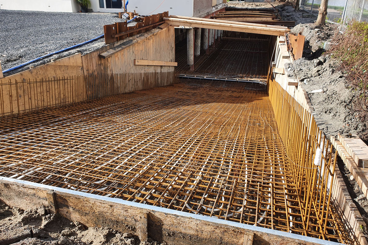 De parkeerkelder, welke gedeeltelijk onder de bestaande woning doorloopt, is door Anton Bouw & Betontechniek BAVU Betonwerken gerealiseerd. Deze klus was een uitdaging ook voor ons. Een kelder met inrit die deels onder een bestaande woning is gesitueerd.