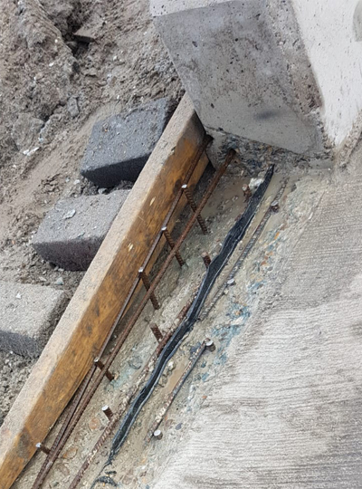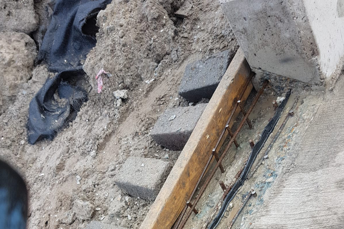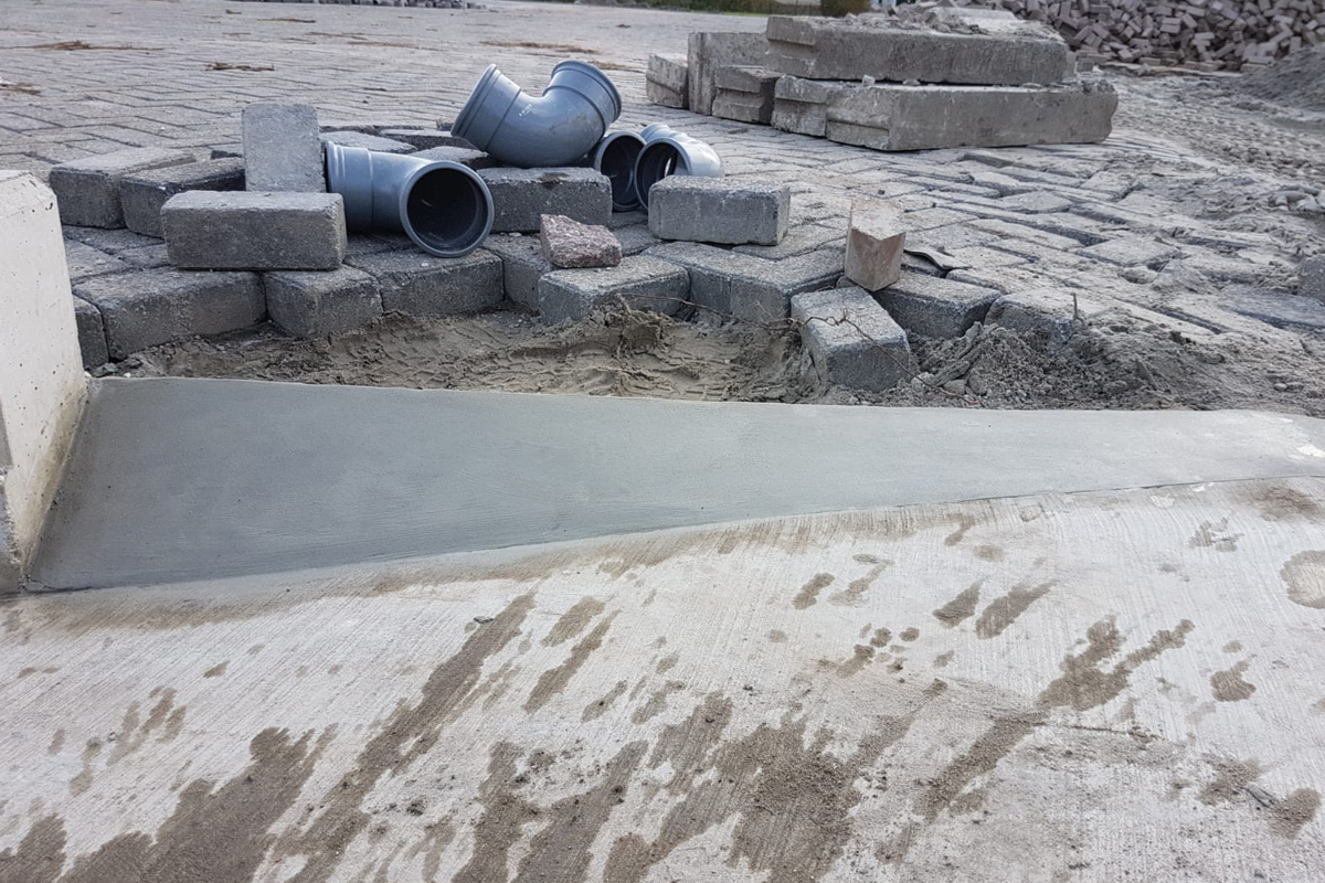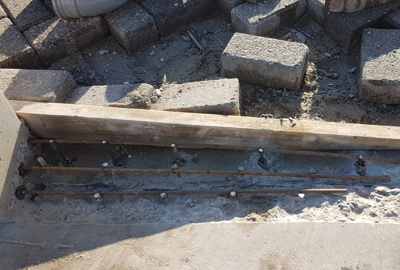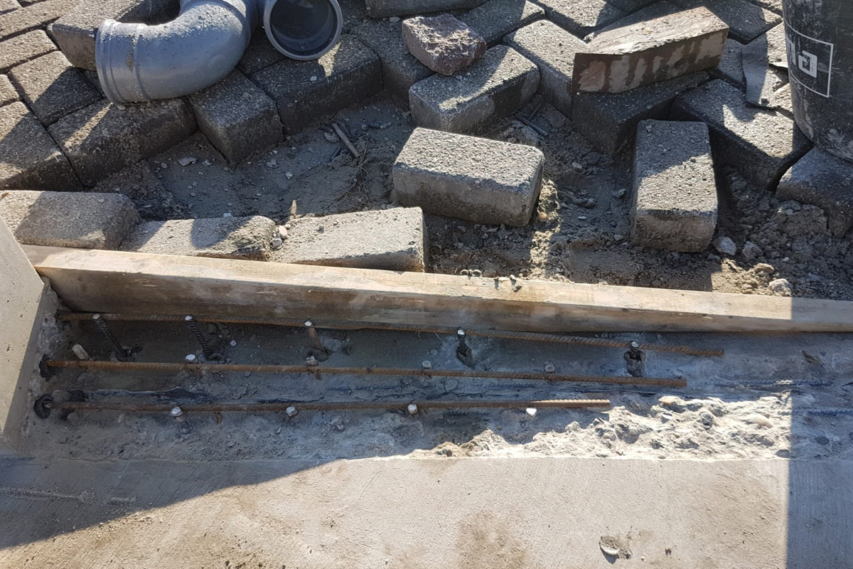 Het werk begon met het slopen van het bestaande beton dat verkeerd was gemaakt. Zodra het slopen klaar was, kon de wapening worden ingeboord en vastgemaakt. Door het stellen van een kistje konden we de hoek van het te repareren deel bepalen.