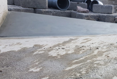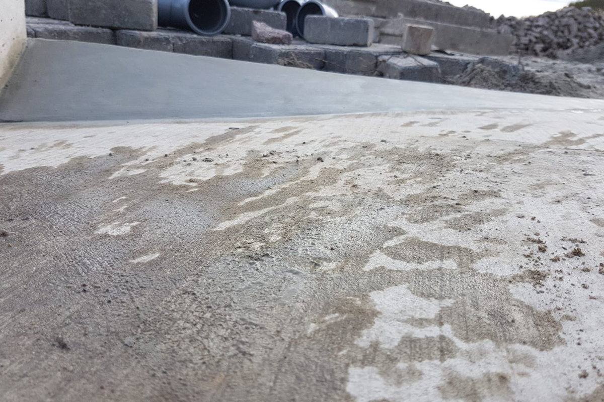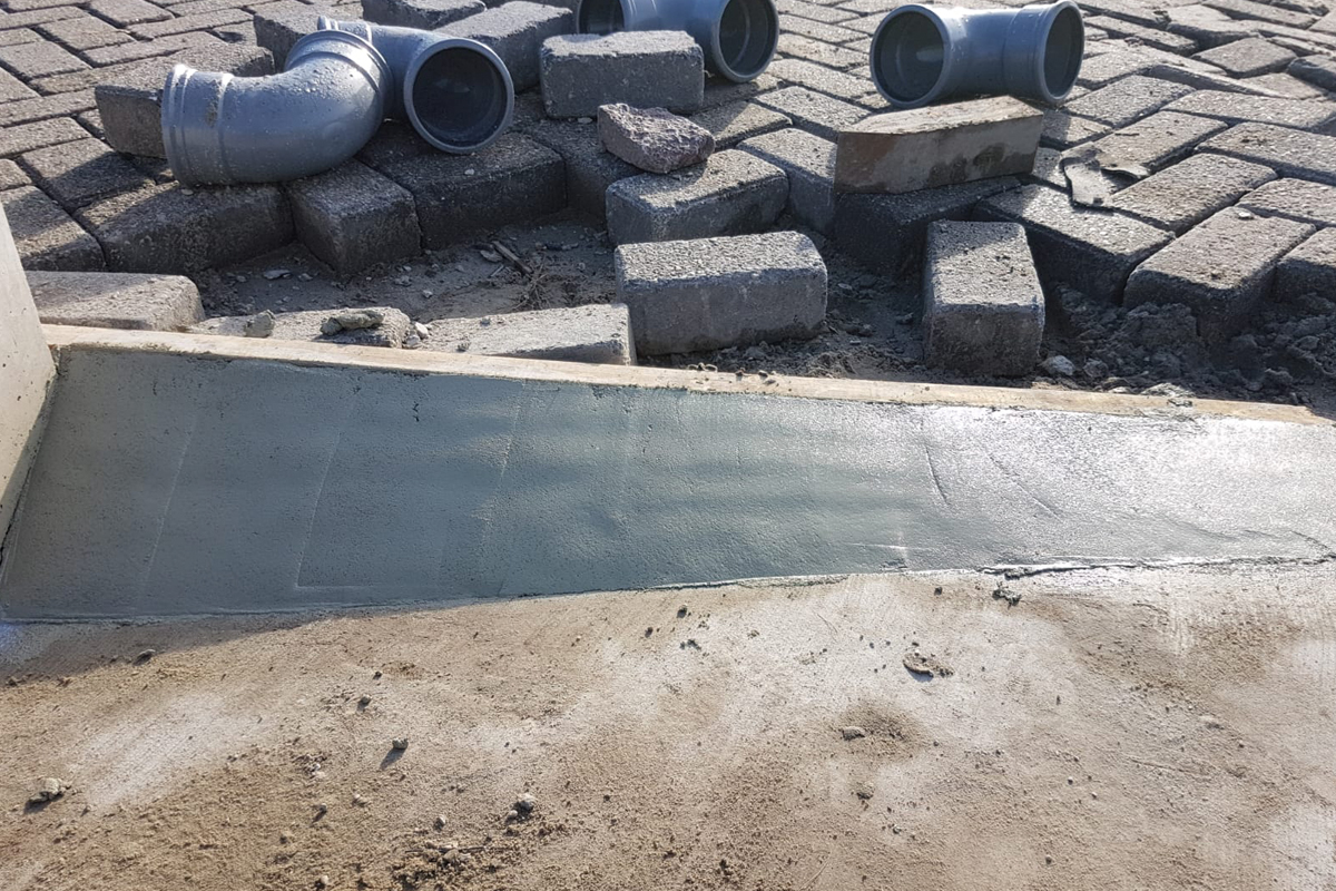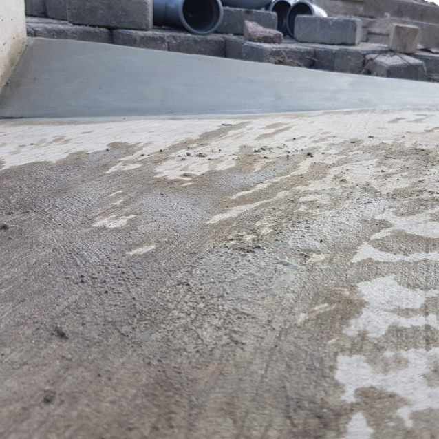 Eerst werd eerst een grove laag mortel opgezet. Deze laag werd ruw opgezet en de dag erna met een fijne mortel afgewerkt. Alvorens we gaan afwerken, schuren we de grove beton iets op voor een betere hechting en smeren de oppervlakte in met hechtprimer.