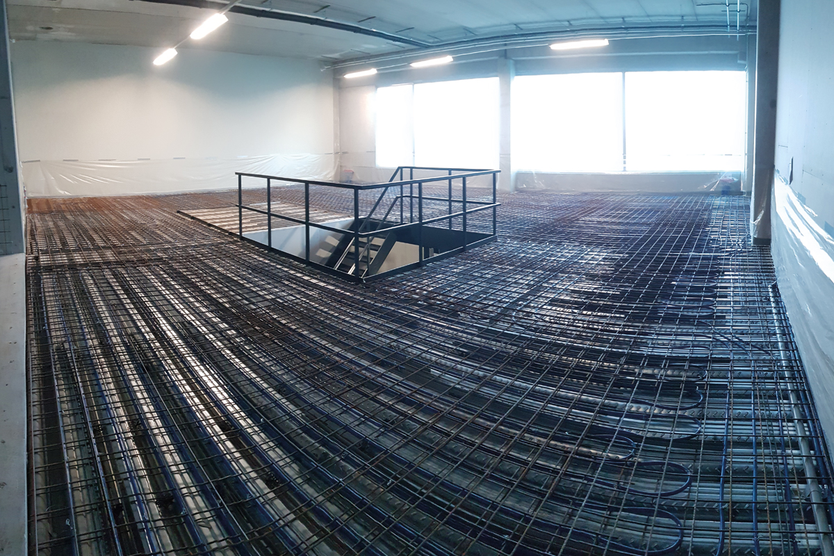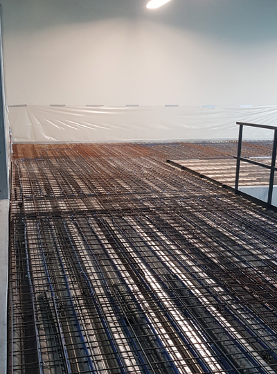 De aannemer (Momeij vof) heeft zelf de stalen vloerplaten gelegd. Hierop hebben wij de wapening aangebracht. Zodra het ondernet was gelegd, heeft de loodgieter de installatie hierop gemaakt. Aansluitend aan het loodgieterswerk hebben wij de bovenwapening aangebracht, waarna het beton kon worden gestort.
