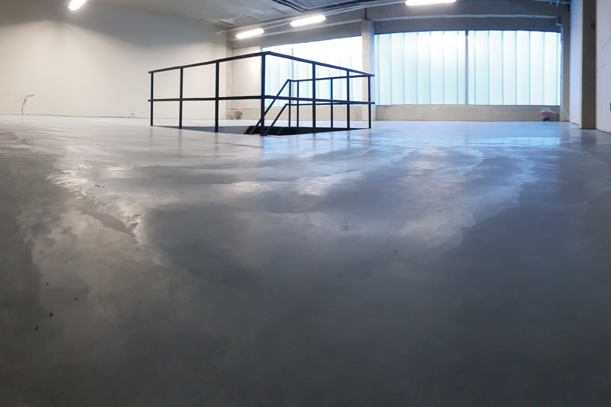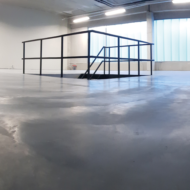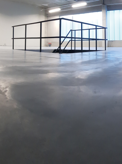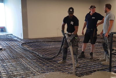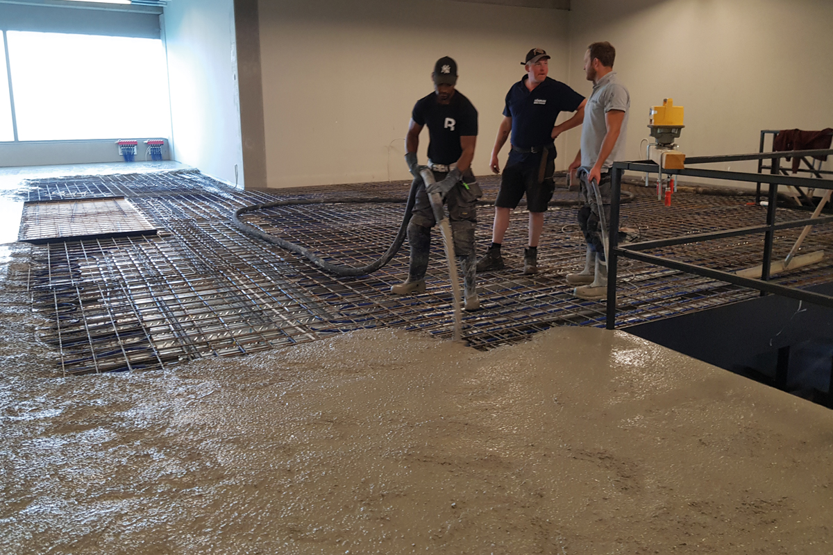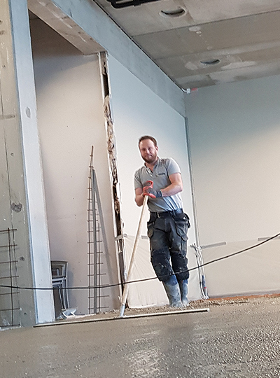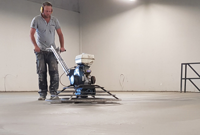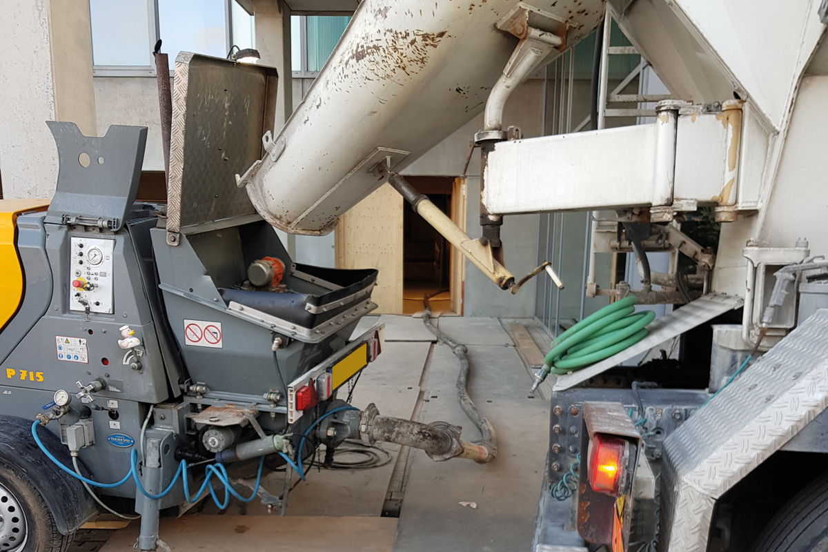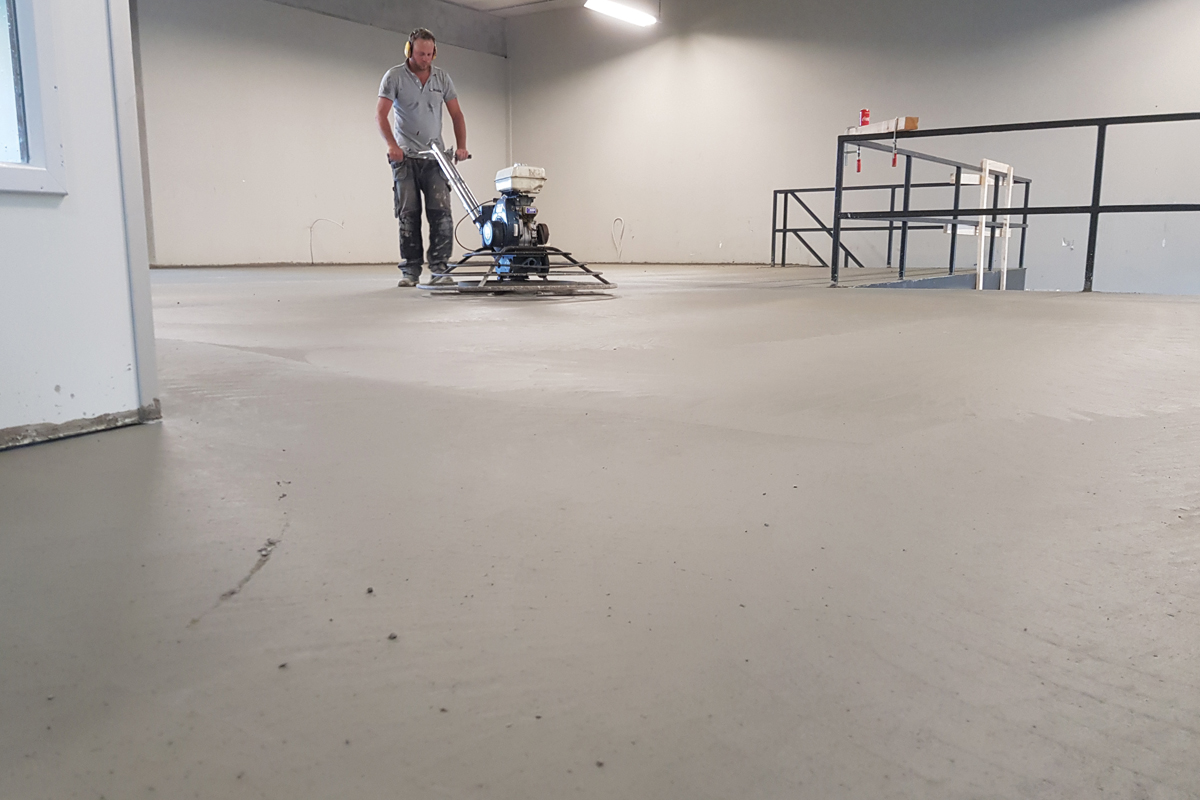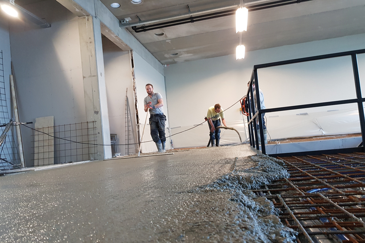 Het beton is gestort met een aanhangerpomp, klein en compact en met handelbare slangen. Wat het werk extra moeilijk maakte, was dat we door het bestaan gebouw heen moesten (trap op!) en er mocht uiteraard niks beschadigd worden. Na aanbrengen van het beton was het tijd voor de afrondende fase: vlinderen van de betonvloer tot een prachtig glad eindresultaat