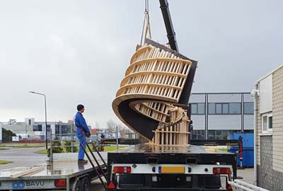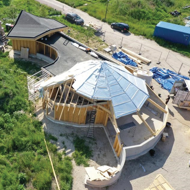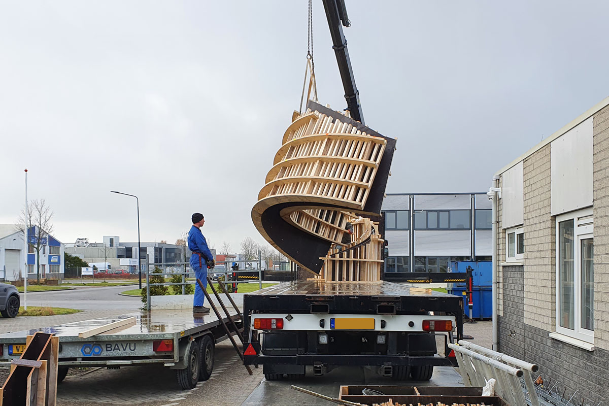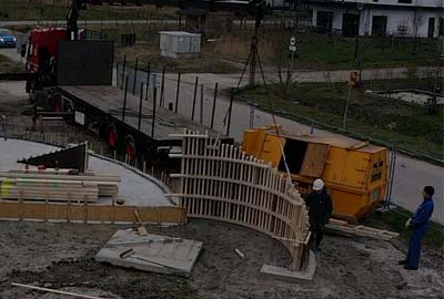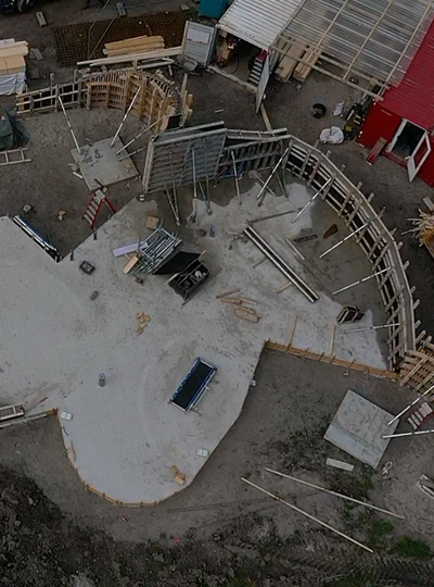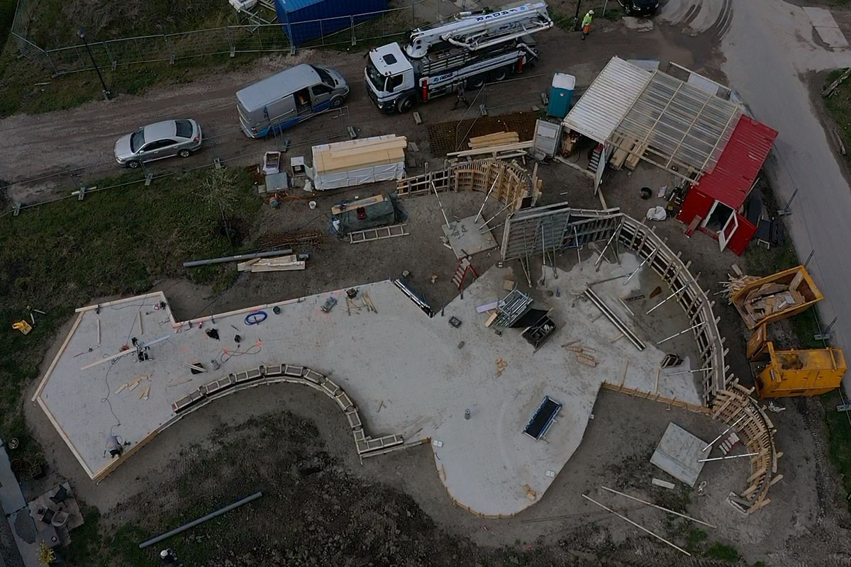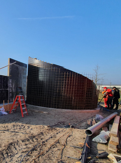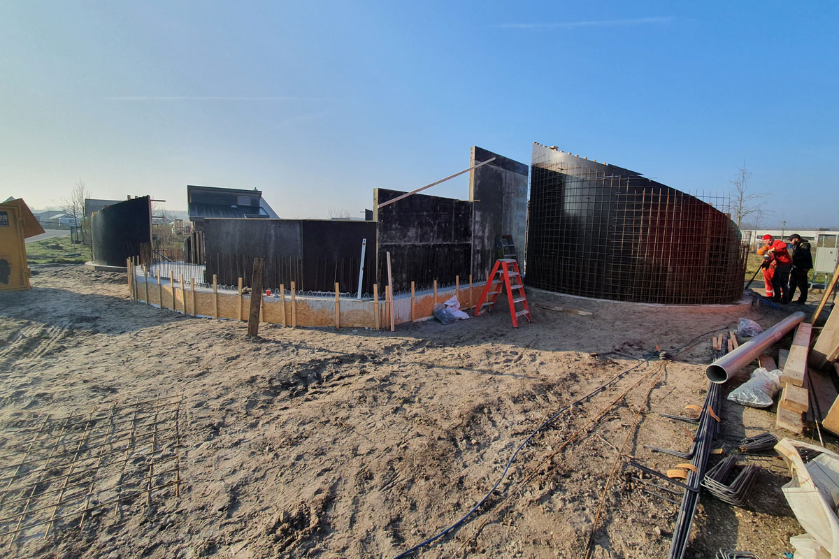 De geïsoleerde vloer hebben wij uitgezet, bekist, bewapend en gestort. Ondertussen werd op de werkplaats de bekisting gemaakt voor de ronde en gesegmenteerde wanden. Toen deze klaar waren konden we ze op transport zetten en op locatie gelijk plaatsen. Na het nodige zet en stelwerk zijn de wanden gestort en ontkist.